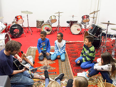 Alle miteinander trafen sich in den unterschiedlichen Räumen der ZIRKUSfabrik, um zum Beispiel die Musik – ein einstudiertes Sternschnuppen-Lied mit vier Schlagzeugen, vielen Gitarren, dem Klavier und der Sängerin zu erleben.