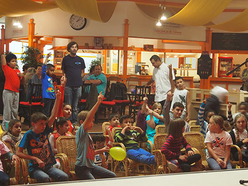 Nach einer herzlichen Begrüßung durch die Sternschnuppen-Vorsitzende und das tolle Zirkusteam, immer wieder ins Arabische übersetzt durch 2 engagierte, ehrenamtliche Übersetzer, begannen die Schnupper- Zirkusworkshops mit 4 Dozenten in den vier Bereichen Tanz, Zirkus (Luft- und Bodenartistik, Balance und Jonglage), Musik und Zauberei und Clownerie.